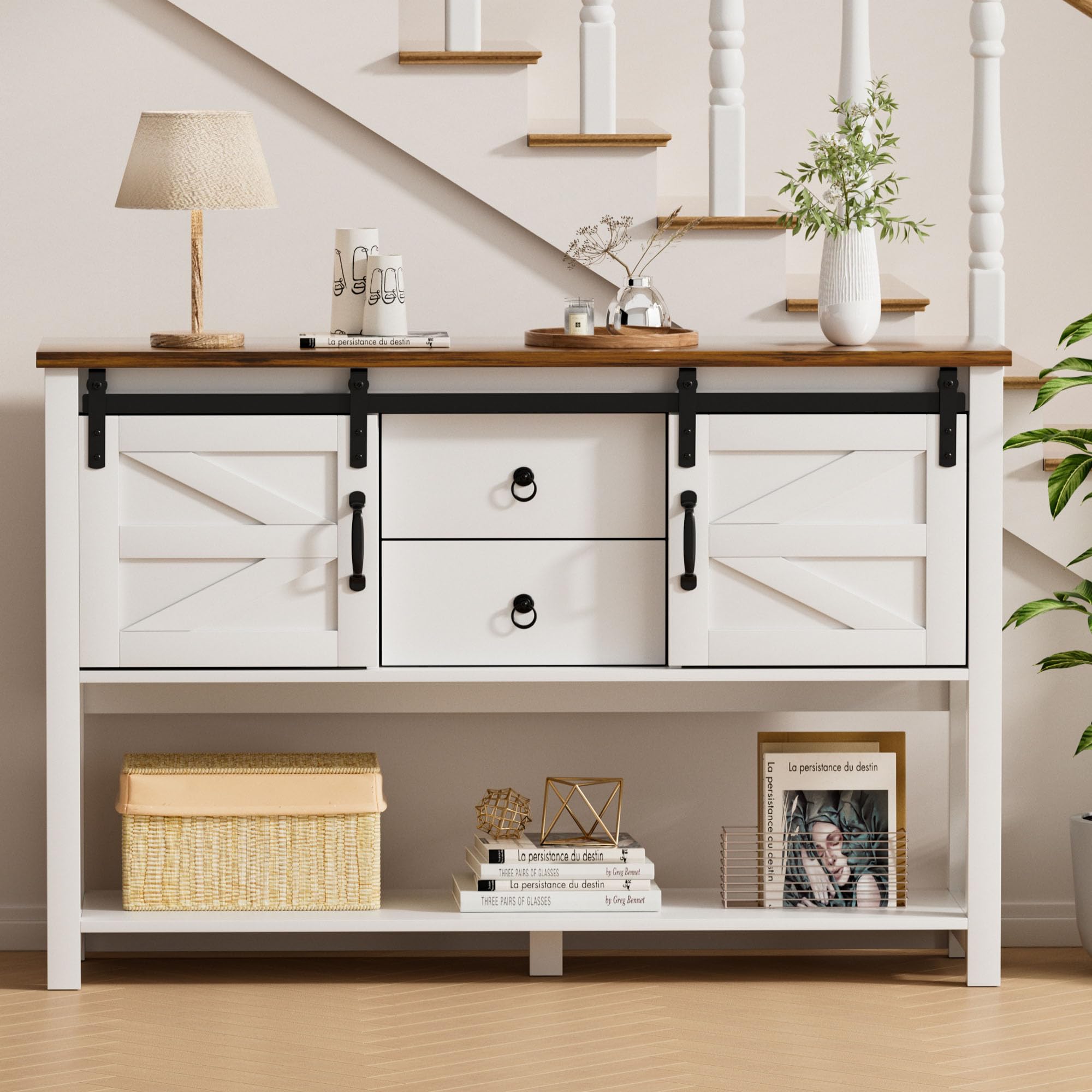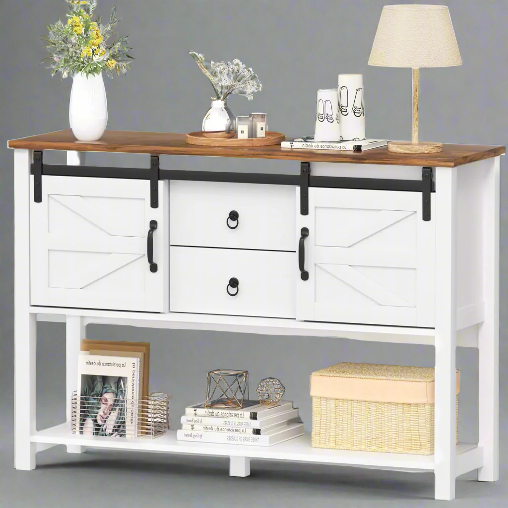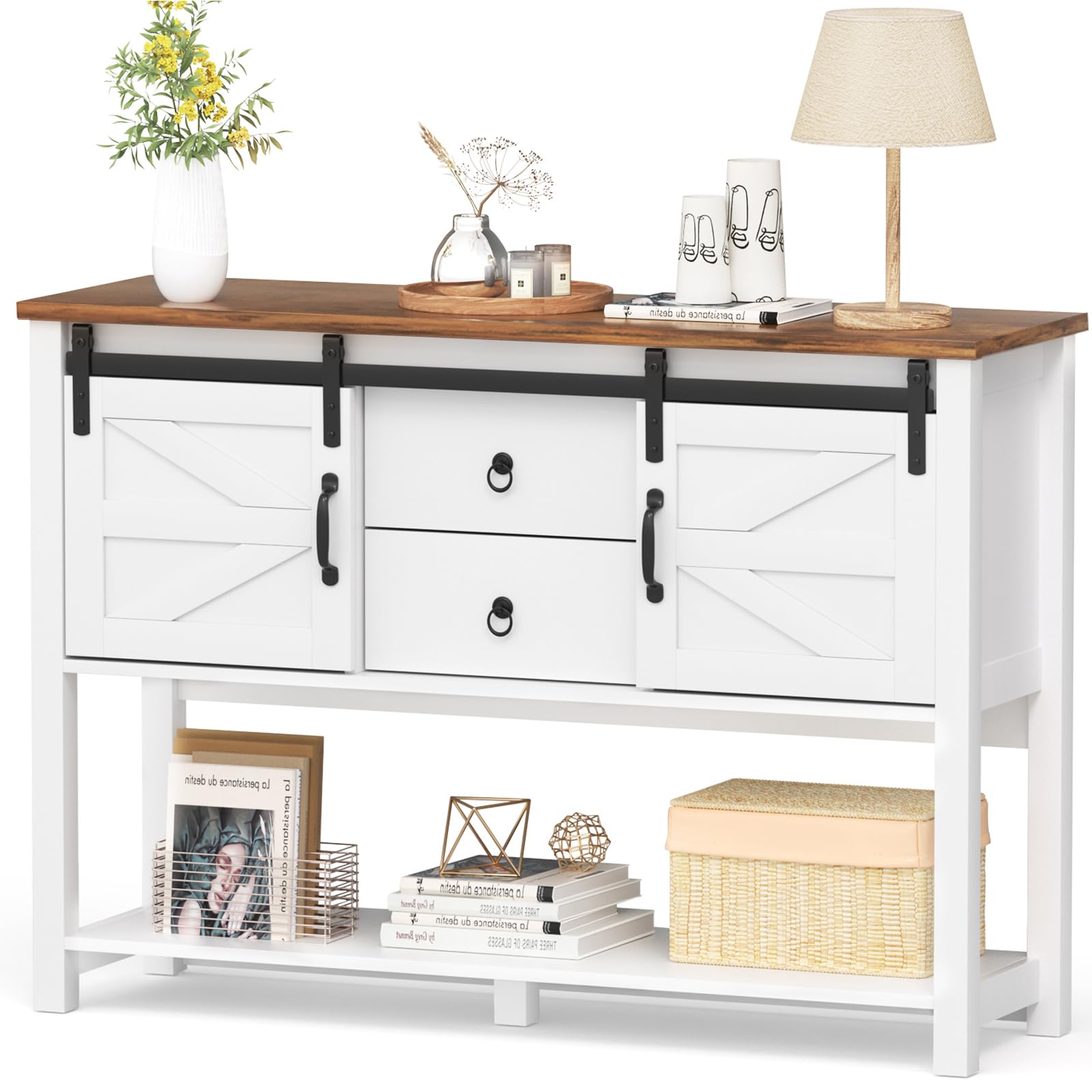 Entryway Table with Sliding Barn Doors and 2 Drawers, 46”Farmhouse Console Table with Storage Shelf, White Rustic Sofa Table Entryway Cabinet for Dining Room, Living Room, Entryway
