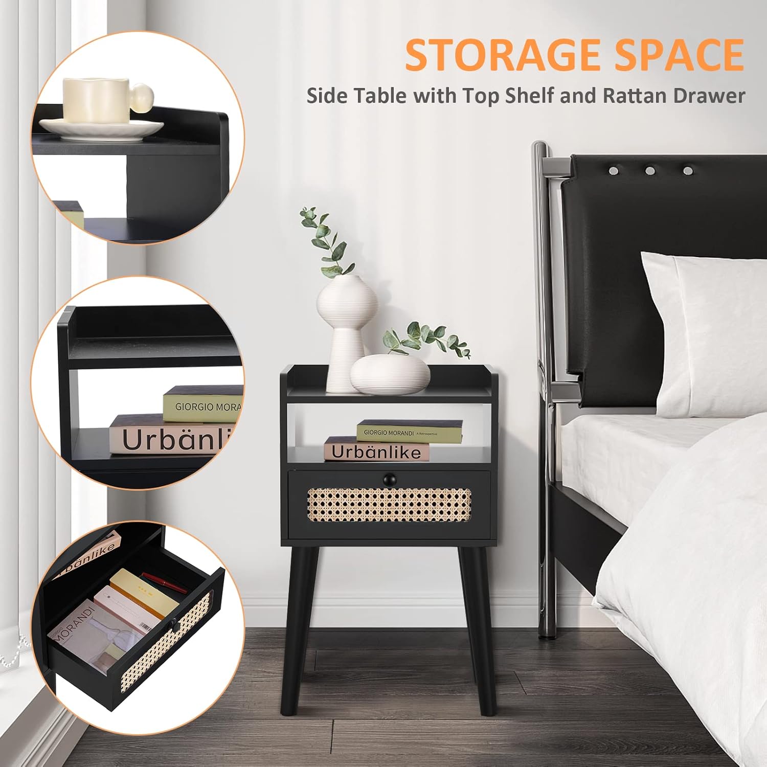 NIGHTSTAND WITH STORAGE: The bedside table's two-level storage design with one open storage shelf and one natural rattan drawer provides more extra storage space. 11.8 "L x 15.4 "W tabletop can hold a lamp, alarm clock, mug, remote control and keys, etc.; books and personal items can be stored in the storage shelf and drawer