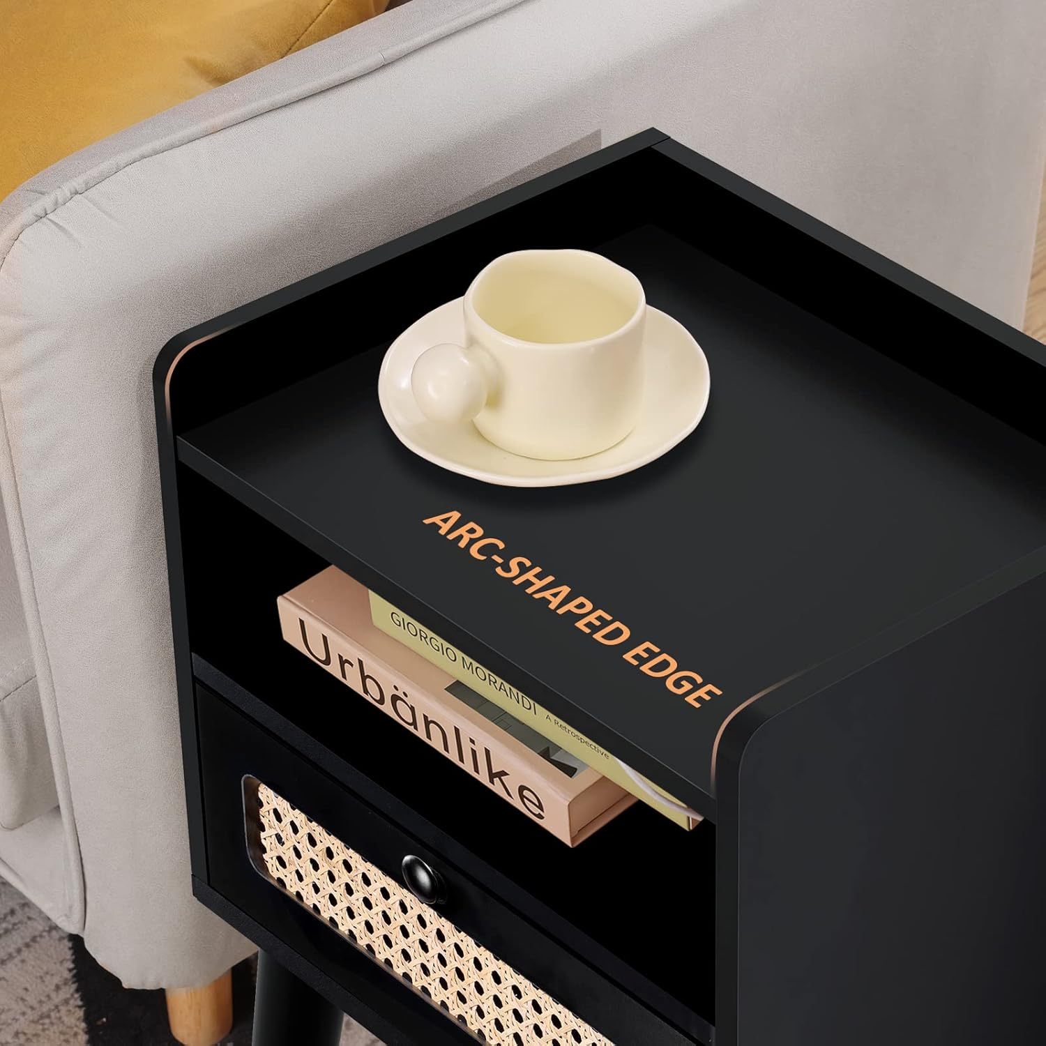 UNIQUE DESIGN: The edge guard design is used around the top of the end table, so you don't have to worry about items falling off the top. The raised edge gives you a sense of security, you can place cups, phones, iPad or other things to protect your items from falling off. Rattan design allows nightstand to be placed in any type of scene without looking out of place, adding a splash of color to your room