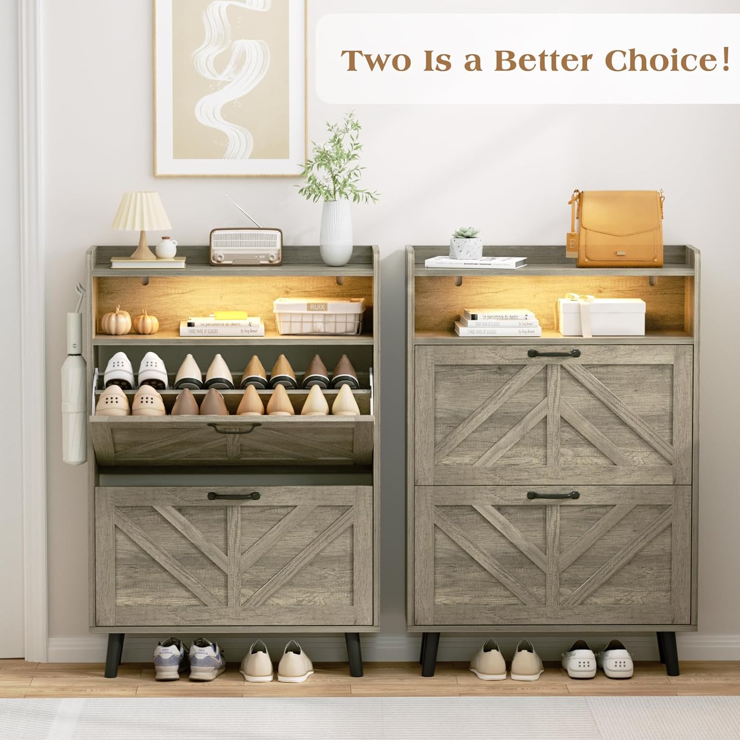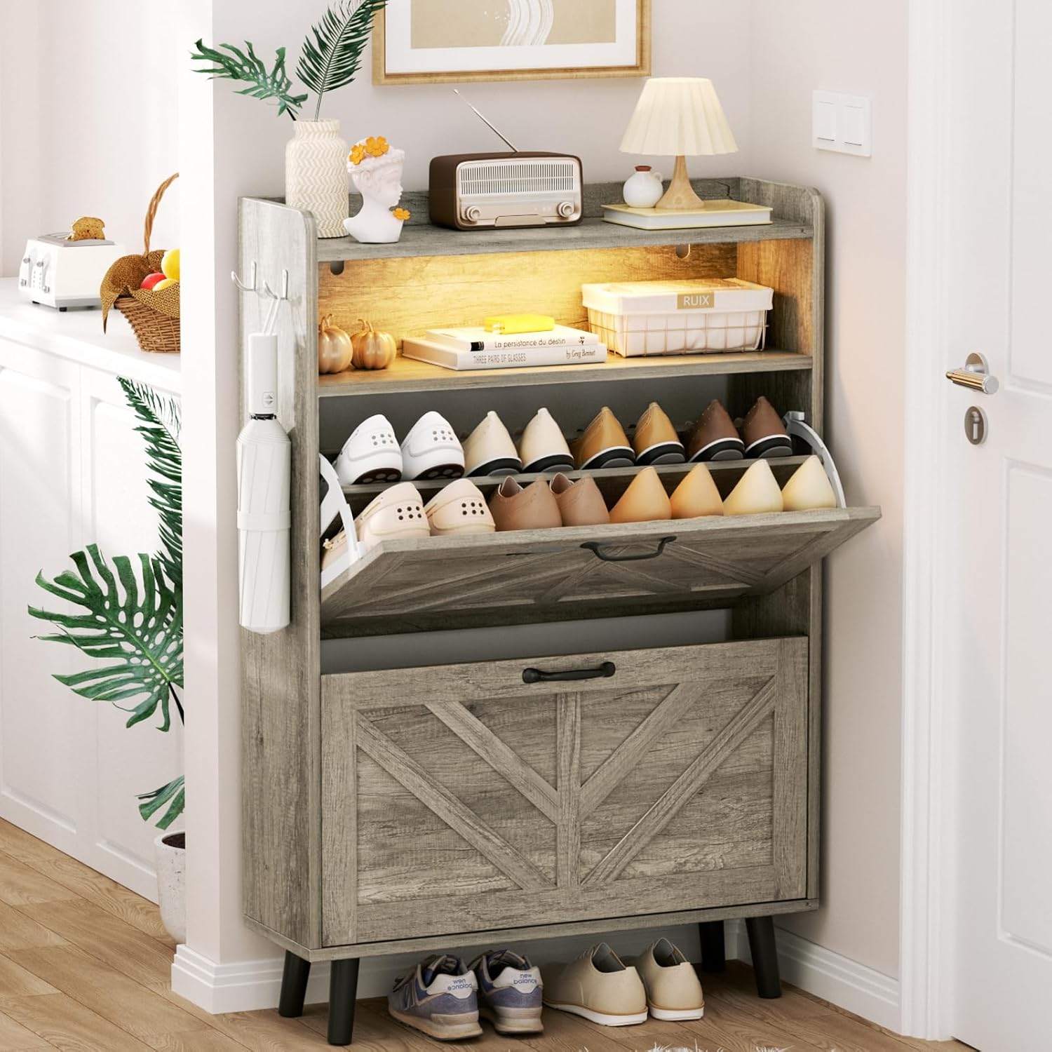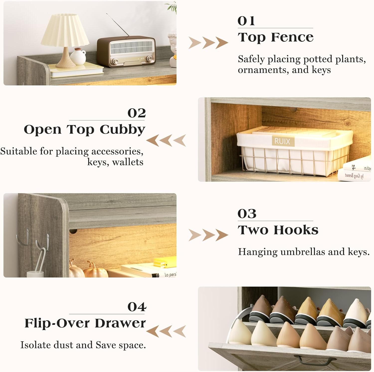 【Large Capacity Shoe Cabinet】The Entryway shoe cabinet is equipped with two flip - over drawers. Each drawer consists of two adjustable or detachable layers. This design provides a multifunctional storage solution for flat shoes, mid - boots or high - heels. Besides, slippers can be conveniently stored at the bottom. There is an independent storage space on the top of the shoe cabinet, and a fence is equipped above it, which is very suitable for safely placing potted plants, decorations and keys to ensure their safety