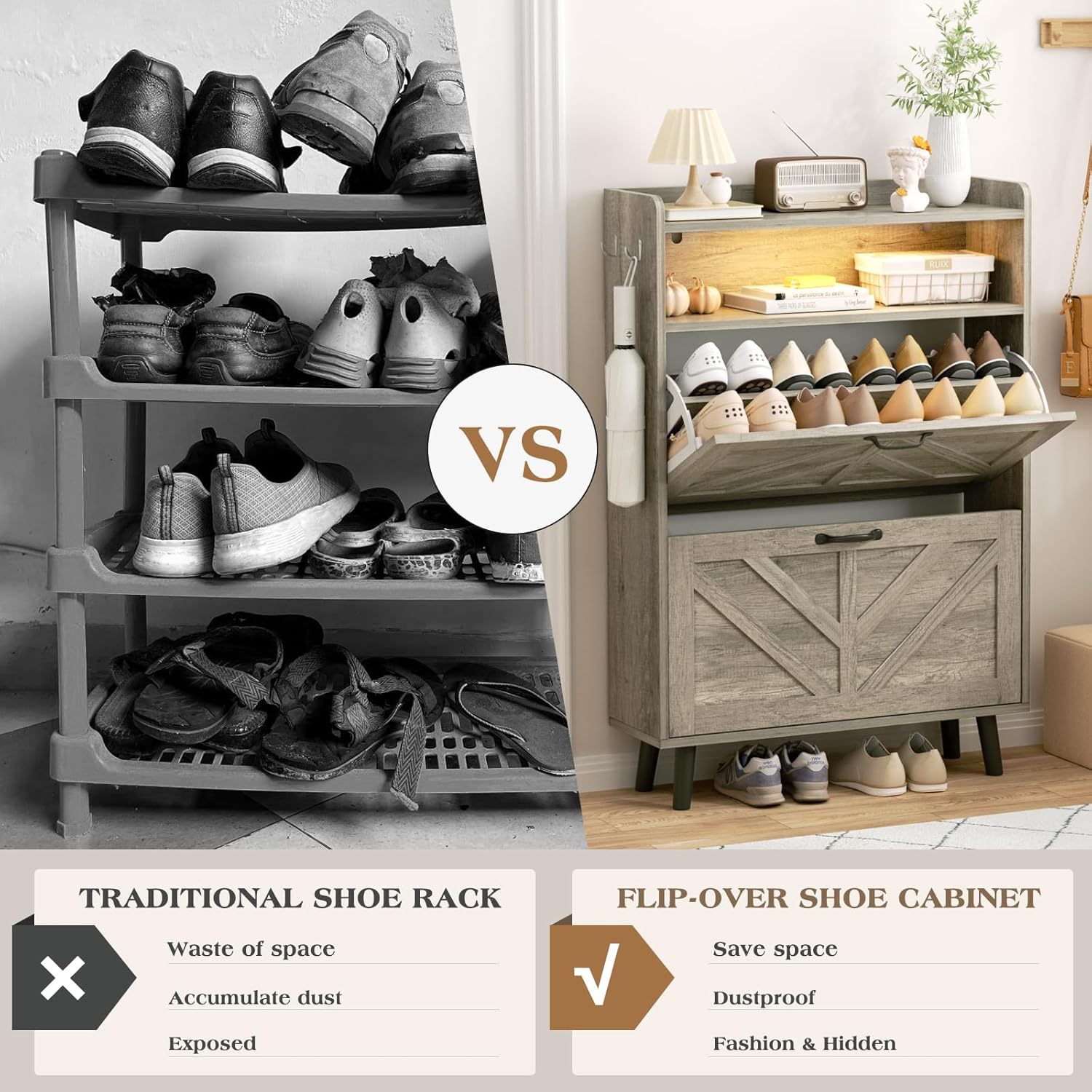 【Flip - Over Drawer Shoe Cabinet】Upgrade your home with our modern free - standing shoe cabinet. The innovative flip - over drawer design, different from the traditional shoe cabinets with doors, enables the narrow - designed shoe cabinet to be effortlessly placed in a narrow space, shielding your shoes from dust and protecting them from pets and insects