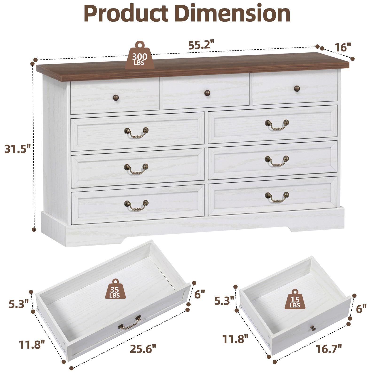 • Vintage Design with Elegant Details – Featuring vintage drawer handles, a wood-grain tabletop, and a white cabinet, this 9 drawer dresser combines modern and farmhouse styles. Its versatile design enhances any space, making it perfect for a chest of drawers in the bedroom or living room.