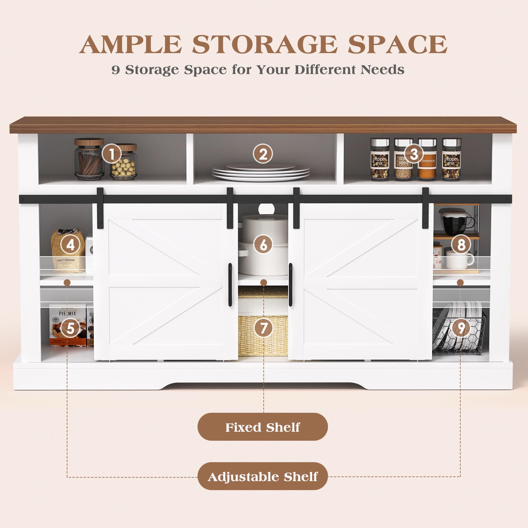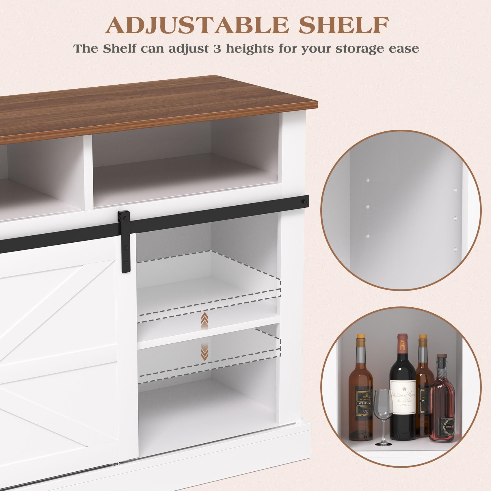 Farmhouse Coffee Bar, 58”Coffee Bar Cabinet with Sliding Barn Door and Adjustable Shelf, Kitchen Buffet Cabinet with Storage for Kitchen, Dining Room, Living Room, White