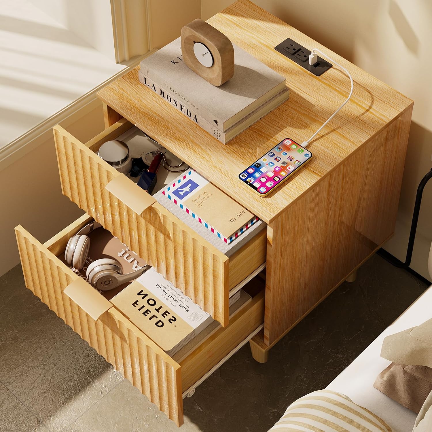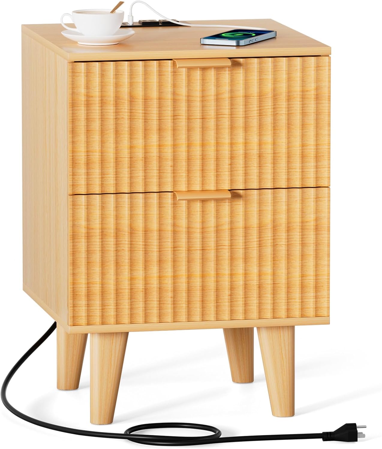 Nightstand with Charging Station: Wooden end table has 2 standard plugs and 2 USB ports are convenient for you to charge mobile devices such as cell phones, iPads, Bluetooth headphones, etc; the long power cord makes it easy to move the bedside table