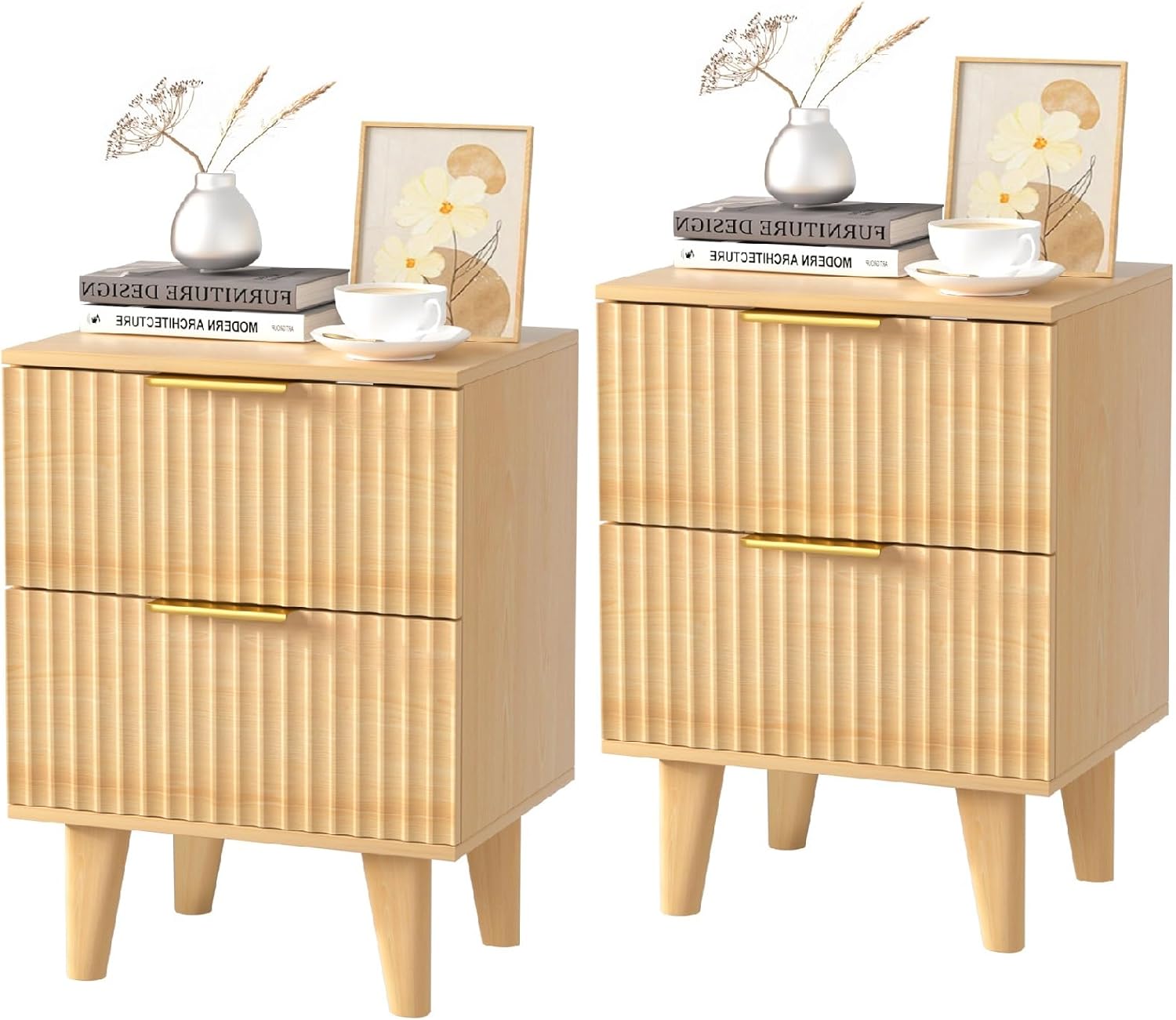 Urban Deco Nightstand Set of 2, Mid Century Modern End Table with 2 Fluted Drawers, Small Bedside Table with Storage End Side Table for Bedroom (Natural), No Charging Station-2pk