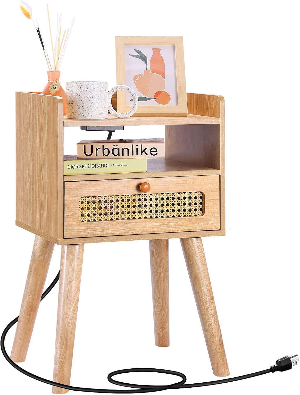 Urban Deco Nightstand with Charging Station,Wooden Bedside Table with Drawer,Modern End Table for Bedroom and Living Room.