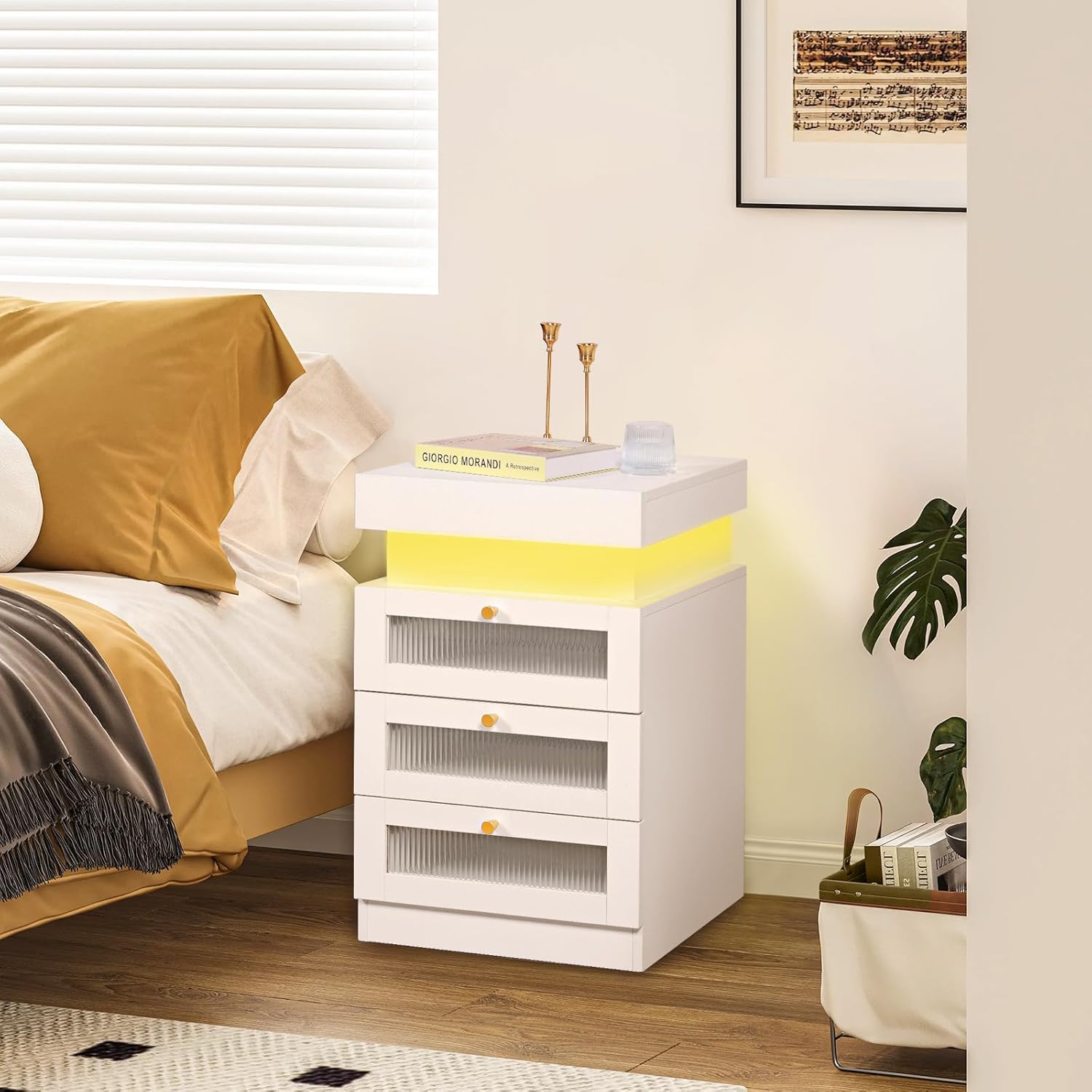 Nightstand with Charging Station: The hidden space at the top of the LED nightstand has a built-in charging station that includes 2 USB ports and 2 power outlets to charge your cell phone, tablet, and other mobile devices; the sliding top prevents dust from falling into the charging station and keeps it clean