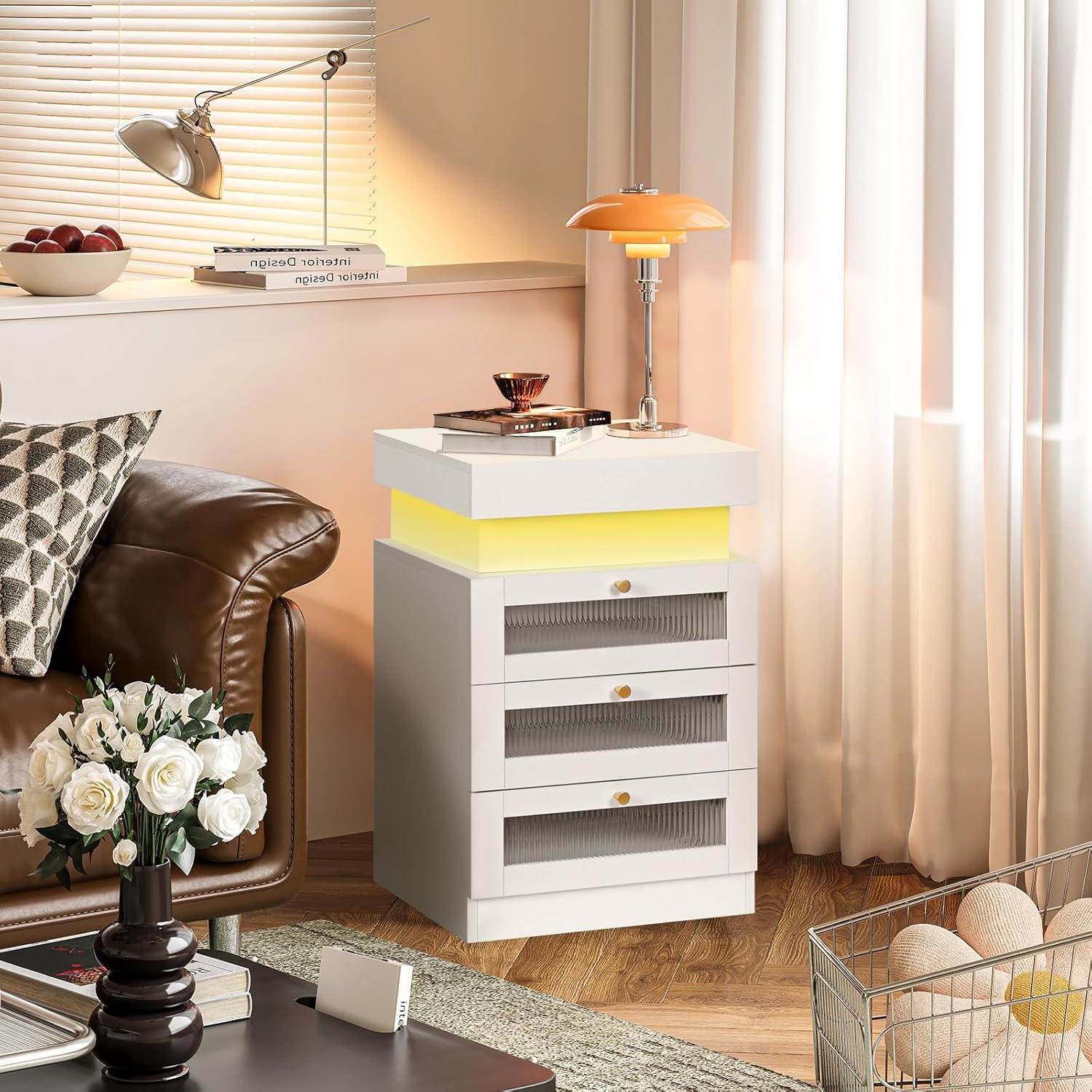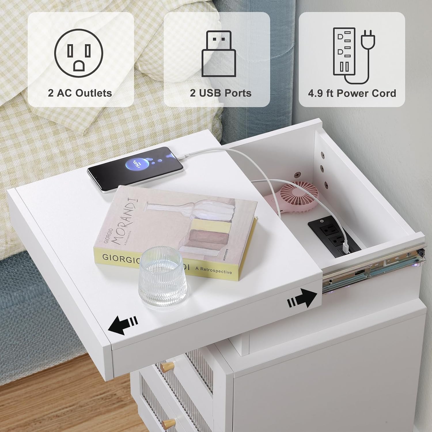 Nightstand with Charging Station: The hidden space at the top of the LED nightstand has a built-in charging station that includes 2 USB ports and 2 power outlets to charge your cell phone, tablet, and other mobile devices; the sliding top prevents dust from falling into the charging station and keeps it clean