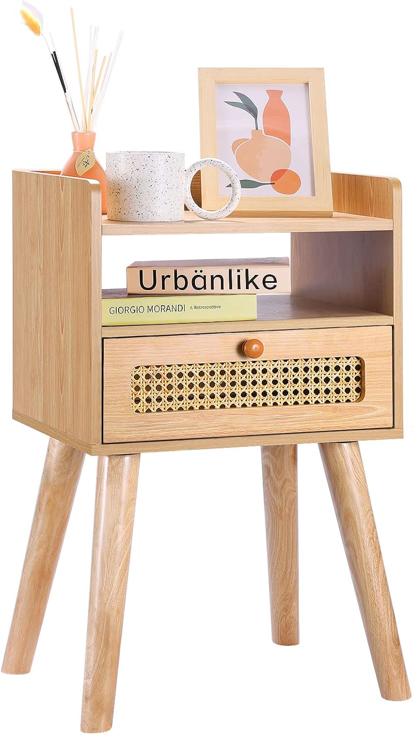 【STABLE & STURDY】: The rattan side table is made of sturdy particle board and strong natural pinewood legs with excellent loading capacity. With arc-shaped edges of top plate instead of normal sharp corner, Urban Deco night stand protects your family members well, especially for kids.