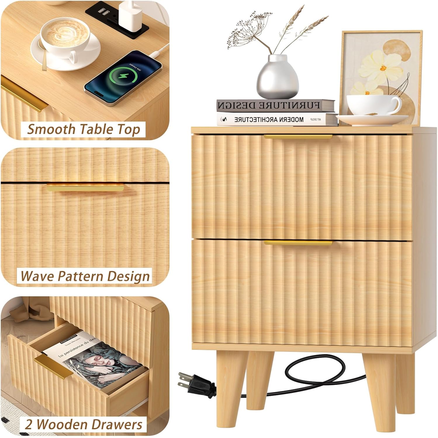 Urban Deco Nightstands Set of 2, Nightstand with Charging Station, Woodon End Table with 2 Fluted Drawers, Modern Bedside Table with Storage for Bedroom (Natural)