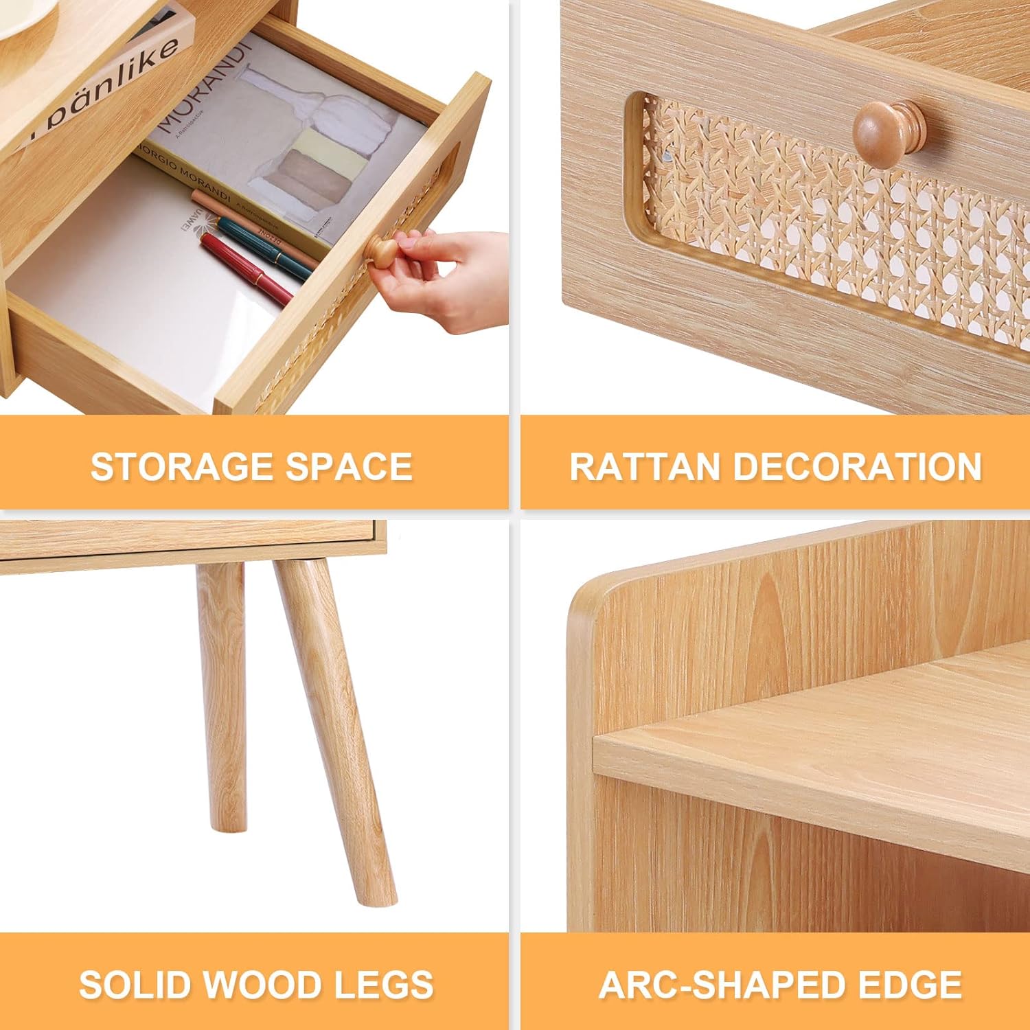 【STABLE & STURDY】: The rattan side table is made of sturdy particle board and strong natural pinewood legs with excellent loading capacity. With arc-shaped edges of top plate instead of normal sharp corner, Urban Deco night stand protects your family members well, especially for kids.